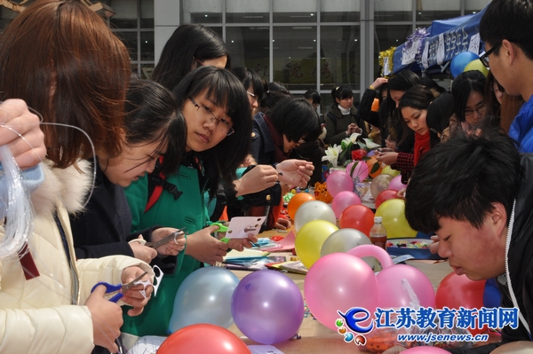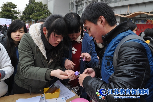 3月7日是女生节,南京邮电大学的女生们在学校的南二广场用自己的巧手做成串珠、钥匙扣等一件件小饰品送给过往的同学和老师。在这么一个富有女人味的现场,记者惊奇地发现不少男生的身影。男女搭配,精心编织,美丽的饰品跃然入目。男生的做派,看着似乎不那么“大男人”,却让女生别有一份温情上心头。