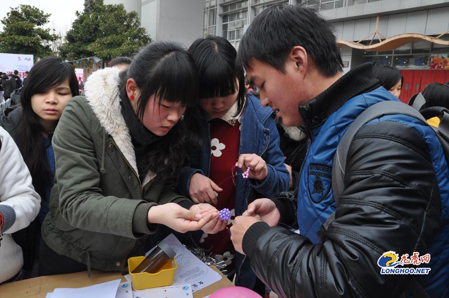 3月7日是女生节,南京邮电大学的女生们在学校的南二广场用自己的巧手做成串珠、钥匙扣等一件件小饰品送给过往的同学和老师。在这么一个富有女人味的现场,记者惊奇地发现不少男生的身影。男女搭配,精心编织,美丽的饰品跃然入目。男生的做派,看着似乎不那么“大男人”,却让女生别有一份温情上心头。
