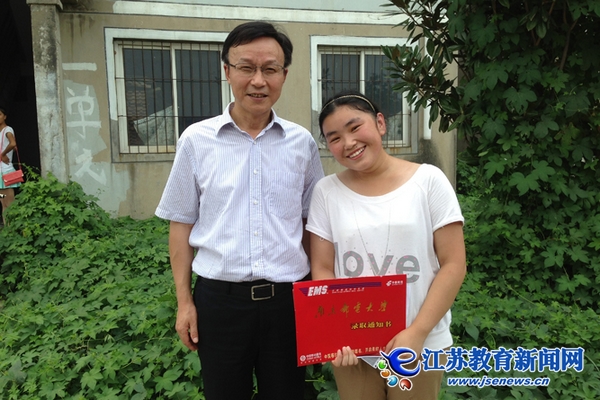 南邮大党委副书记朱永平教授为沭阳县中学司慧灵颁发录取通知书